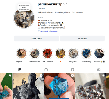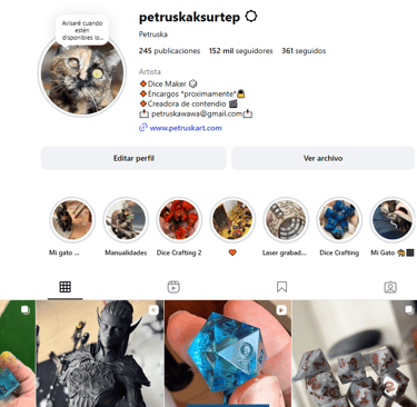 En mi Instagram publico procesos de creación de dados, fotos de los nuevos productos y encuestas en las que podéis decidir el color, la forma o la temática de algunos proyectos.